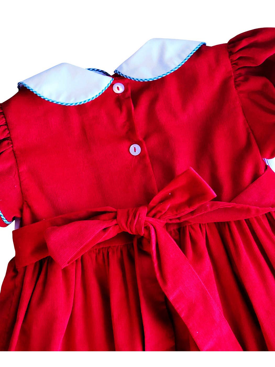 Christmas Noel Collection. Girl's red corduroy Christmas dress. "Noel" is hand smocked on white fabric on the chest. White collar with puffed sleeves. 100% cotton corduroy. Made in El Salvador.
